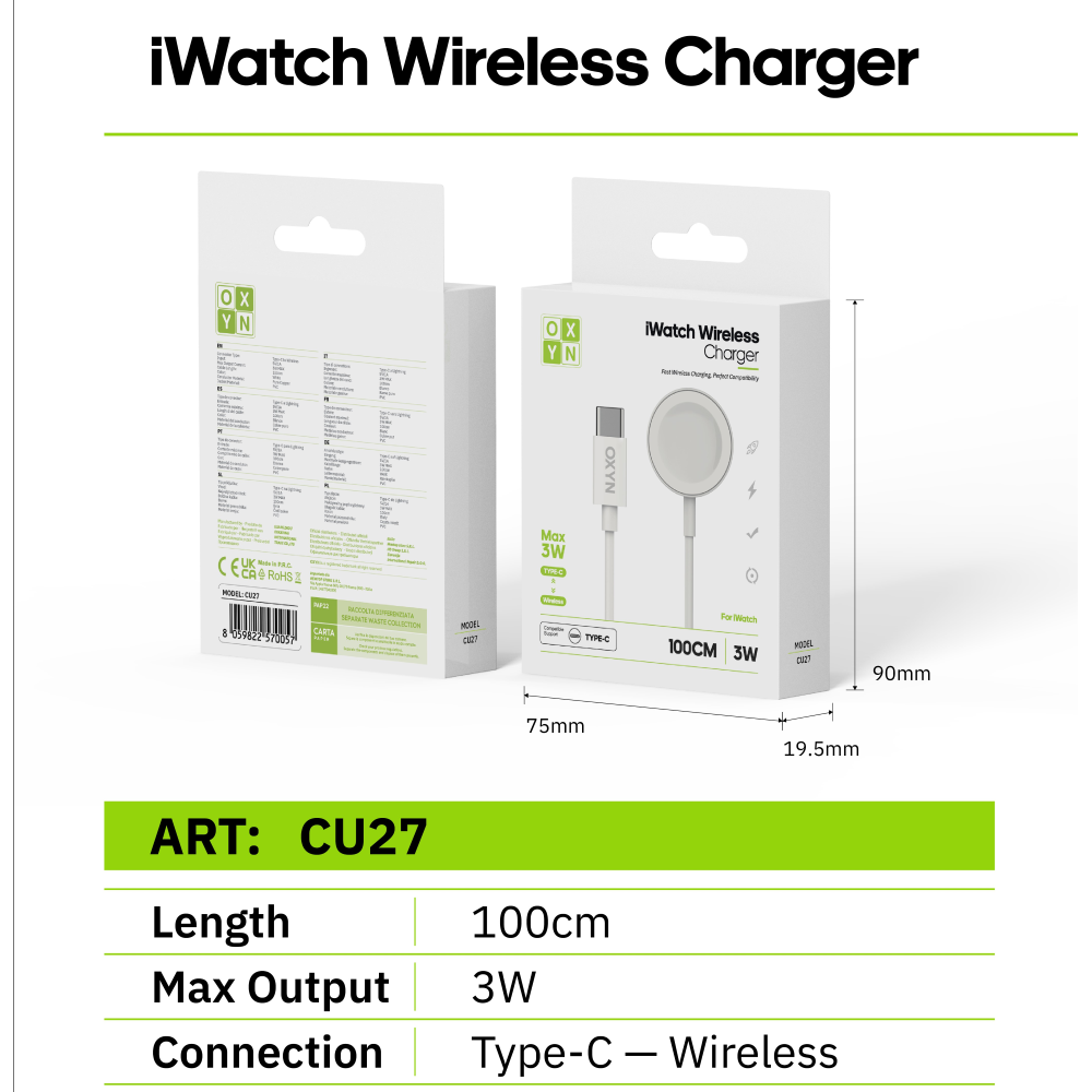 Compatibile con tutti i modelli di Apple Watch, il cavo di ricarica OXYN CU27 è la scelta ideale per gli utenti che cercano un'opzione di ricarica affidabile e di alta qualità.