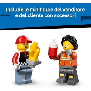 COSA C’È NELLA SCATOLA? Include tutto ciò di cui i bambini hanno bisogno per costruire il Food Truck delle patatine LEGO® City, oltre alle minifigure del venditore e del cliente e accessori