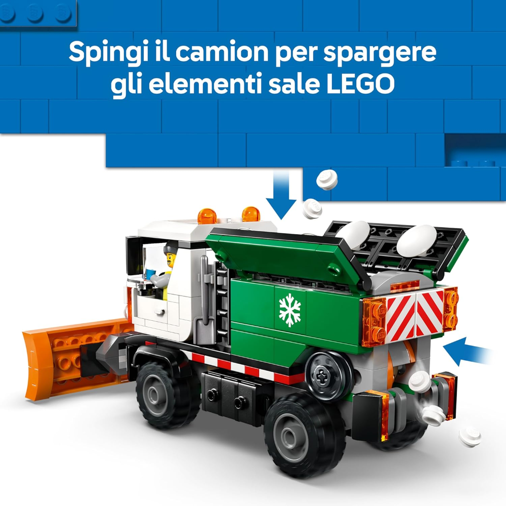 PROPRIO COME IL MODELLO VERO: i bambini possono inclinare, alzare e abbassare la pala sgombraneve, spingere il camion giocattolo per disperdere gli elementi sale LEGO®, inclinare la cabina per accedere al motore e posizionare la minifigure del conducente al volante