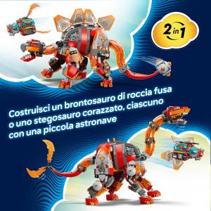 OPZIONI DI COSTRUZIONE 2 IN 1: i bambini possono scegliere di costruire un brontosauro forgiato dalla lava con una doppia coda o uno stegosauro corazzato con una coda frustante infuocata, ciascuno dei quali include un’astronave di riserva