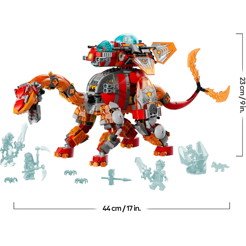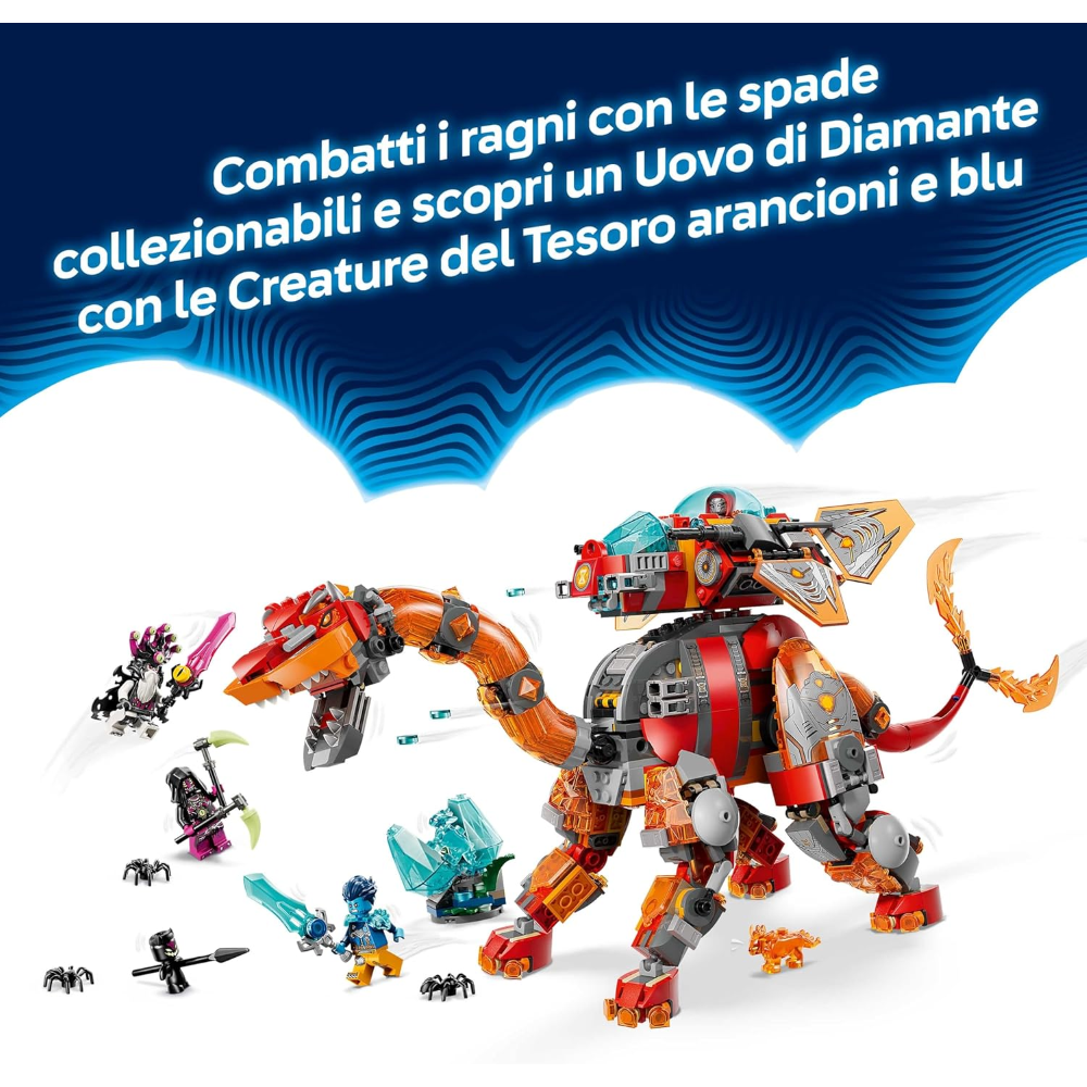 Il brontosauro č un imponente dinosauro forgiato da roccia fusa, dotato di un’enorme coda gemellare (pronta a spazzare via qualsiasi cosa sul suo cammino) e di un’astronave staccabile, mentre lo stegosauro č una bestia da battaglia con armatura rinforzata, una coda frustante e un’astronave separata. Il kit da costruzione con dinosauri include anche 4 minifigure che incoraggiano il gioco di finzione e sono dotati di spada collezionabili per combattere 3 ragni, oltre a un uovo di diamante e creature del tesoro arancioni e blu.