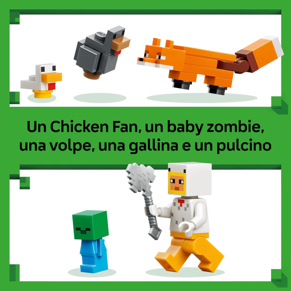 PERSONAGGI DELLA FATTORIA MINECRAFT®: il set Fattoria di galline LEGO® Minecraft (21585) include una minifigure di Chicken Fan, più un baby zombie (ama portare le galline a fare un giro), una volpe, un Cold Chicken e un pulcino