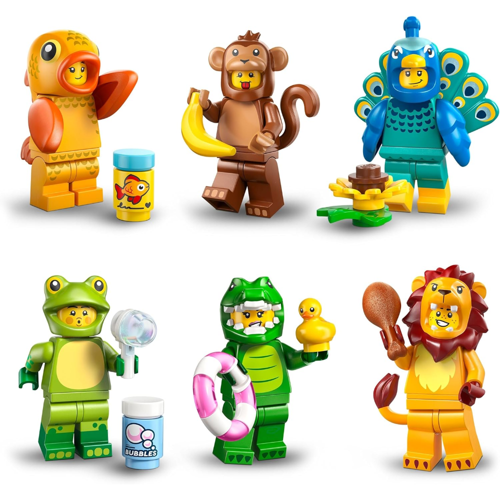 1 DI 12 ANIMALI: divertiti con 1 dei 12 giocattoli in ogni scatola, tra cui le minifigure in costume da leone, rana, coccodrillo, scimmia, koala, pappagallo, cane, adorabile coniglio, pesciolino d’oro, tenero gatto, pavone e delfino