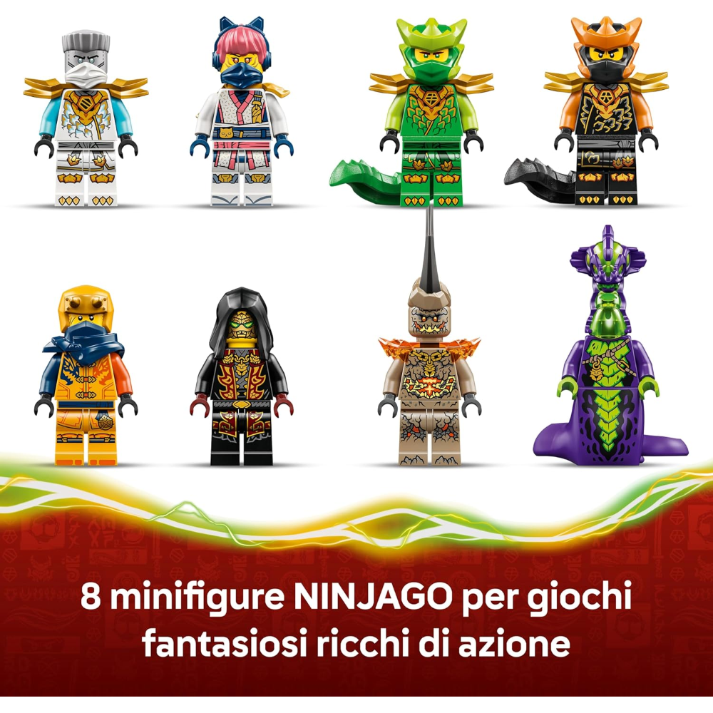 8 MINIFIGURE NINJAGO®: il giocattolo d’avventura per bambini contiene Zane, Sora, Arin, Lloyd Forma Drago, Cole Forma Drago, il Mostro Acido, il Mostro della Terra e il Leader dei lealisti per un gioco di fantasia ricco di azione