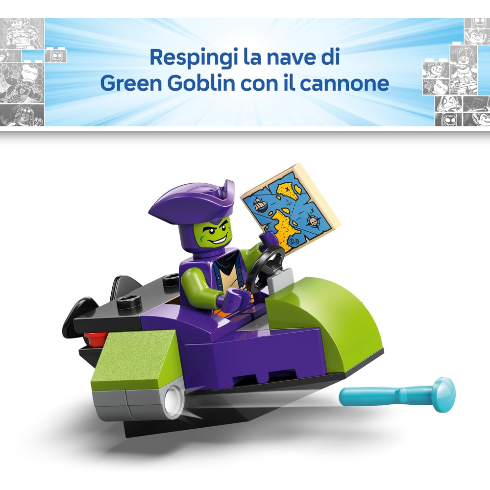 DIVERTENTI ACCESSORI PIRATESCHI: i bambini possono fare fuoco con un cannone e altri shooter, catturare un pesce, uno scrigno del tesoro o persino la barca di Goblin utilizzando la corda a ragnatela di Spidey e tanti altri fantastici accessori