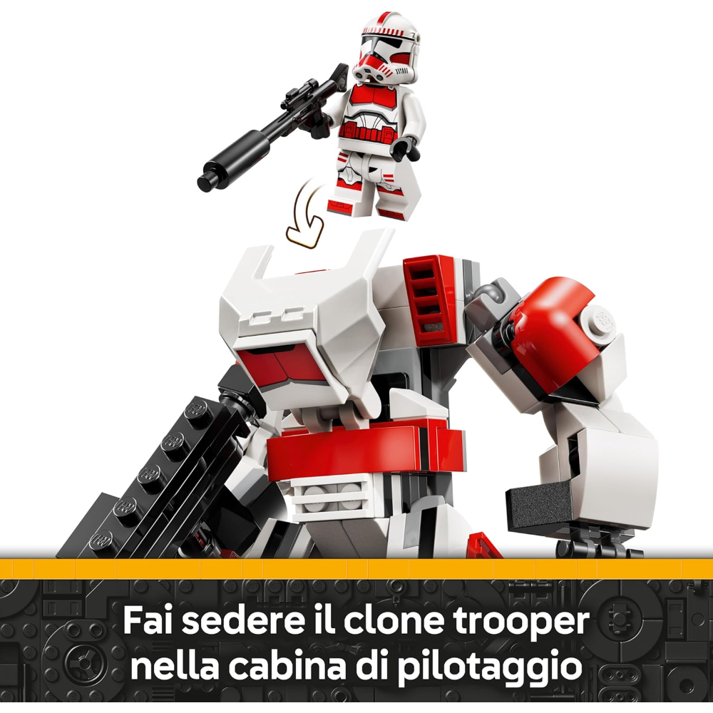 Metti la minifigure LEGO del Clone Shock Trooper nel cockpit del mech e aggancia il suo fucile blaster sul retro. Regola le braccia, le gambe e i piedi dei mech per creare pose di combattimento. Metti il grande fucile blaster nelle sue mani e attiva il suo shooter. Con la sua armatura nei caratteristici colori rosso e bianco dei Clone Shock Trooper, il mech è anche bello da esporre nelle camerette dei bambini tra le missioni di gioco.