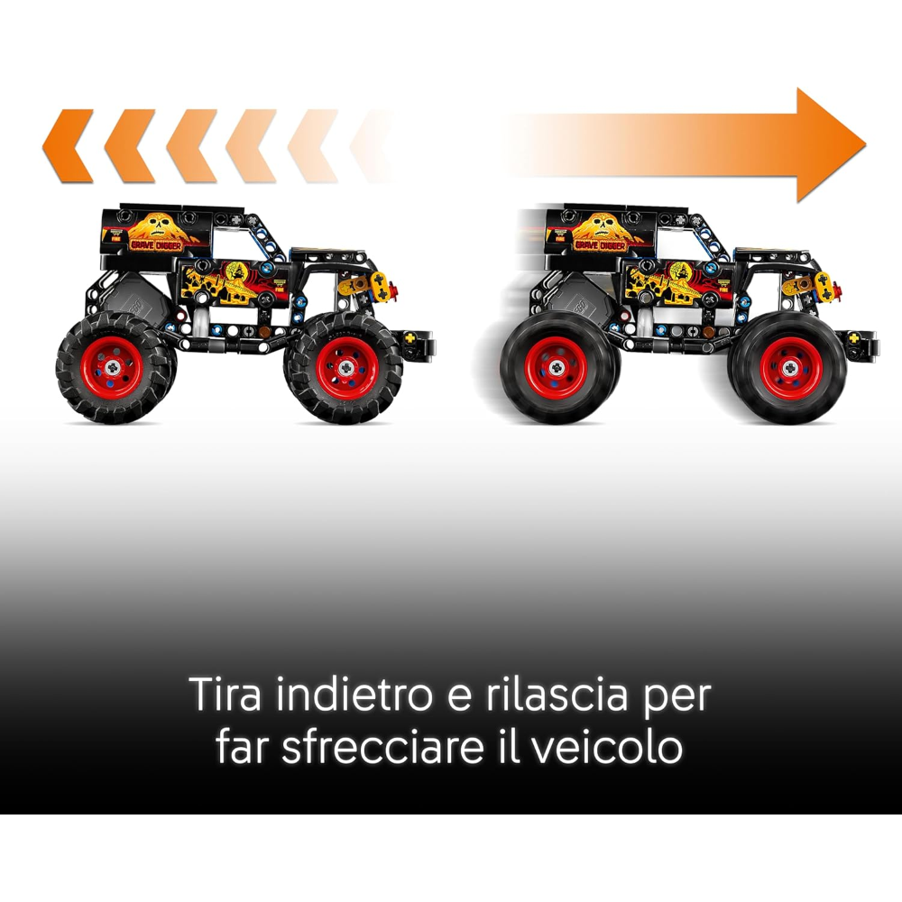 Usa la funzione pull-back per lanciare in azione il camion giocattolo Monster Jam Grave Digger™ Fuoco e Ghiaccio LEGO® Technic (42219).