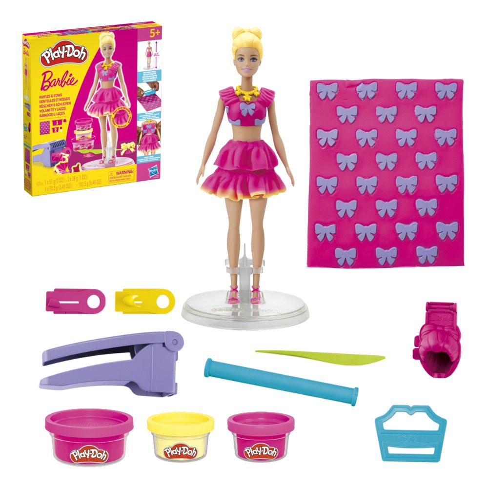 Il kit include una bambola Barbie, un supporto, uno stampo per capelli, un timbro, un paio di scarpe, un coltello, un rullo, un foglio con il modello Play-Doh e 3 barattoli di pasta modellabile Play-Doh, per un totale di 185 g.