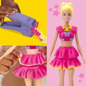 Basta posizionare la bambola sul supporto, usare il foglio con il modello Play-Doh e le formine per creare abiti e vestirla con stili fantasiosi.