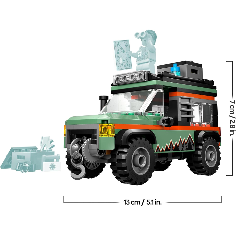Set con veicolo LEGO ricco di accessori per minifigure: include una macchina fotografica giocattolo, una bottiglia d’acqua, una torcia elettrica, una mappa, una bussola, un binocolo, strumenti e un kit di pronto soccorso per il gioco di finzione
