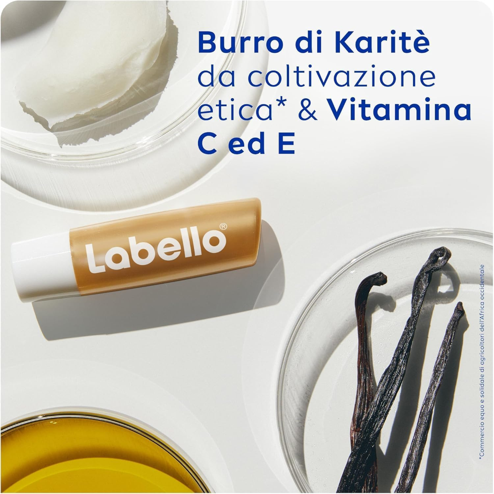 CONTENUTO DELLA CONFEZIONE – Labello Vanilla Buttercream, burro di cacao idratante e fondente sulle labbra, con oli naturali e burro di karité, 1 stick da 4.8 g