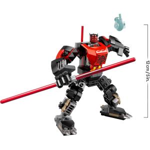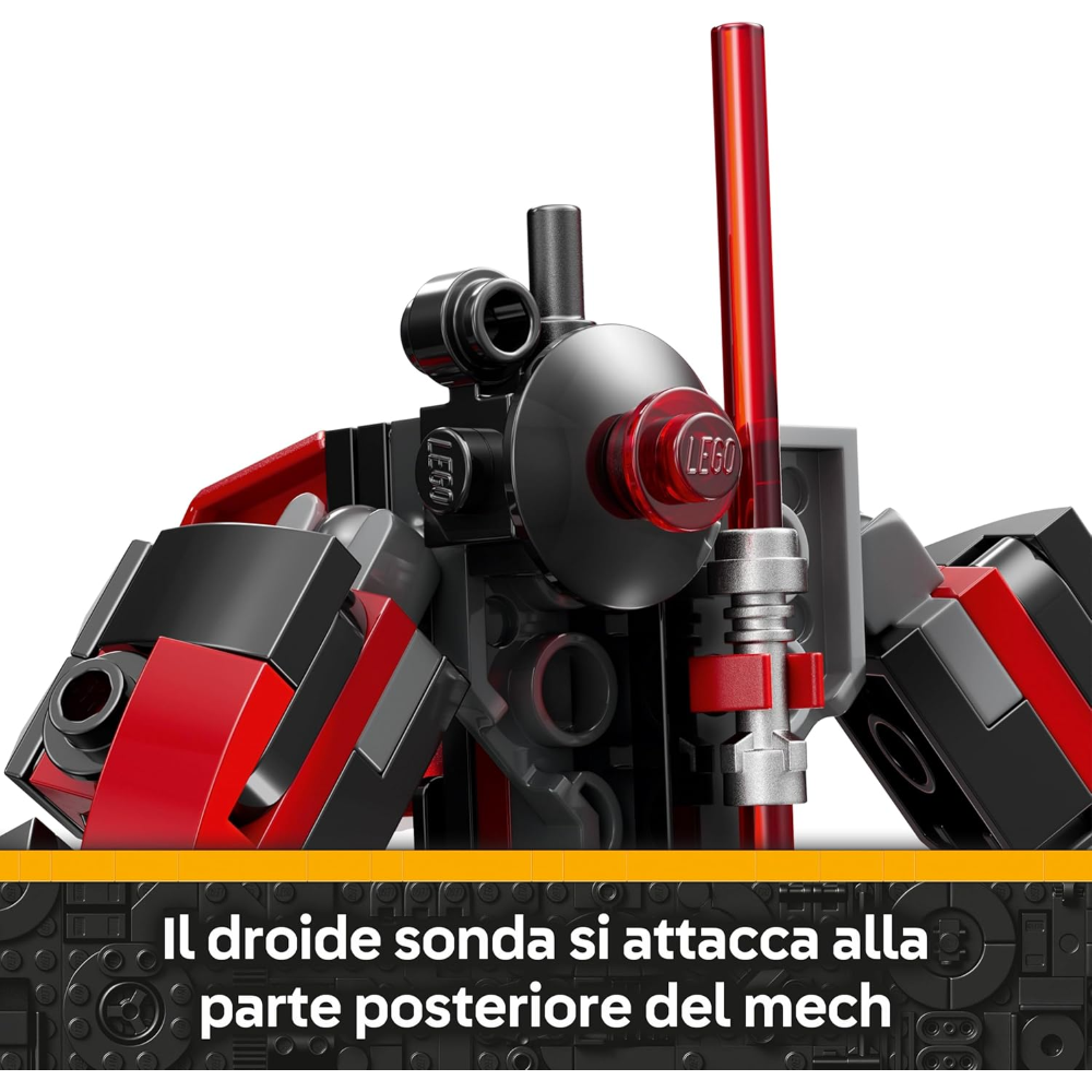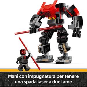 Personaggio LEGO Star Wars di Darth Maul: la minifigure LEGO di questo iconico personaggio Star Wars è dotata di una spada laser giocattolo di colore rosso con doppia lama, che può essere agganciata alla parte posteriore del mech