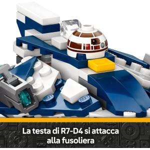 Ore di gioco di finzione: il set include anche la testa di R7-D4, applicabile alla fusoliera davanti alla cabina di pilotaggio del veicolo LEGO, in modo che sembri che il fedele droide possa accompagnare Plo Koon nelle sue missioni