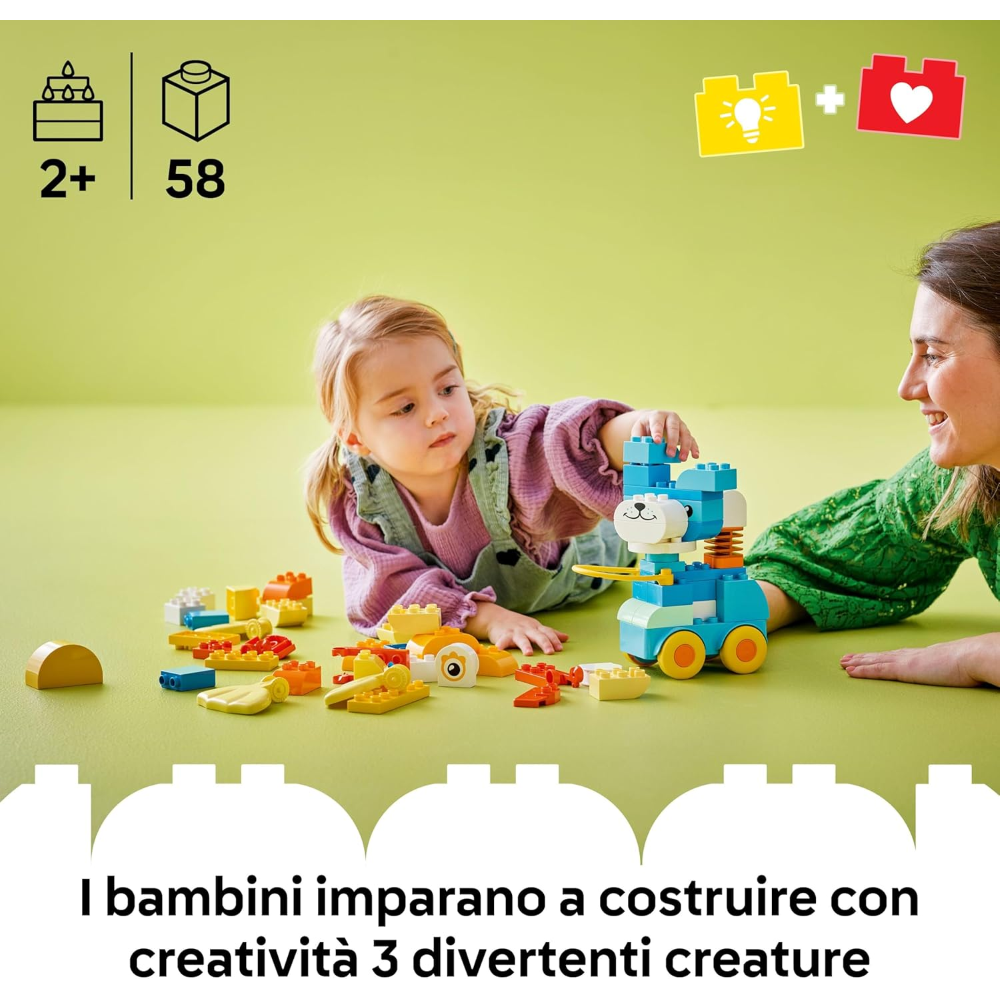 Gioco di ruolo creativo con possibilità illimitate: i 58 mattoncini consentono ai piccoli in età prescolare di costruire 3 animali; un’anatra, un cane giocattolo o un pesce, oppure qualsiasi creatura che la loro immaginazione possa inventare