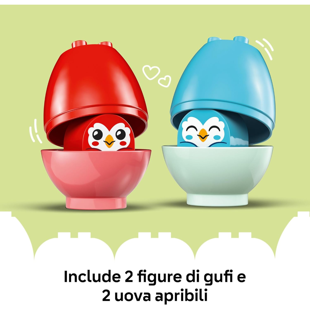 Set LEGO DUPO con uccelli giocattolo: sono compresi 2 gufi, 2 uova tattili apribili e una casa sull’albero con finestra apribile, per dar vita a tante ore di giochi di ruolo con i mattoncini LEGO