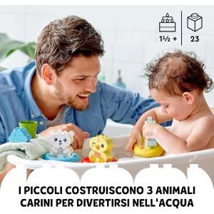 Il set di giochi LEGO DUPLO Ora del Bagnetto: Treno degli Animali Galleggiante, include una papera, un orso polare e un ippopotamo giocattolo, 3 ciambelle galleggianti, un secchio e una nuvola per la pioggiaGli animali giocattolo possono essere facilmente assemblati grazie ai 2 mattoncini LEGO DUPLO, le 3 ciambelle si aprono per essere sciacquate e mantenute igienicamente pulite bagno dopo bagno