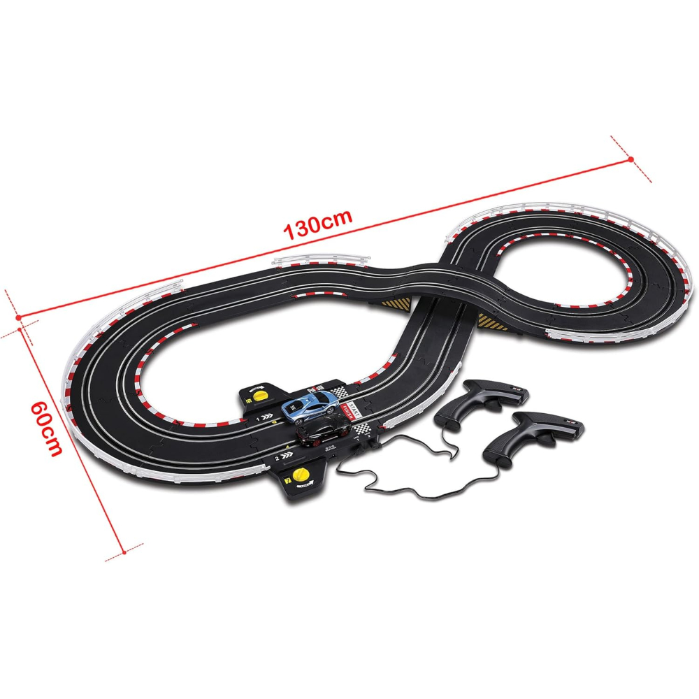 Componenti del circuito: 12 curve, 3 rettilinei, 2 binari concavi, 2 binari convessi, 4 supporti per i binari e 12 guardrail per un tracciato realistico e impegnativo.