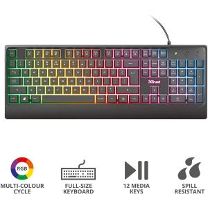 Preparati all'azione con la tastiera da gaming illuminata Trust Ziva. Il layout integrale e i tasti multimediali ti offrono il controllo completo, il solido design ti permette di giocare senza sosta e le luci LED creano l'atmosfera adatta per la vittoria.